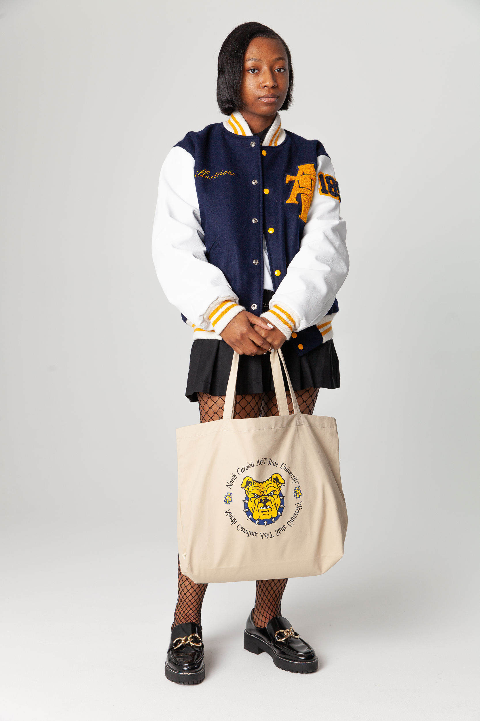 The apparel includes Champion sweats and long-sleeve shirts featuring original graphics by students. For N.C. A&T, there are six pieces including a premium letterman jacket produced by Ebbets Field Flannel representing the students’ interpretations of the collegiate staple.