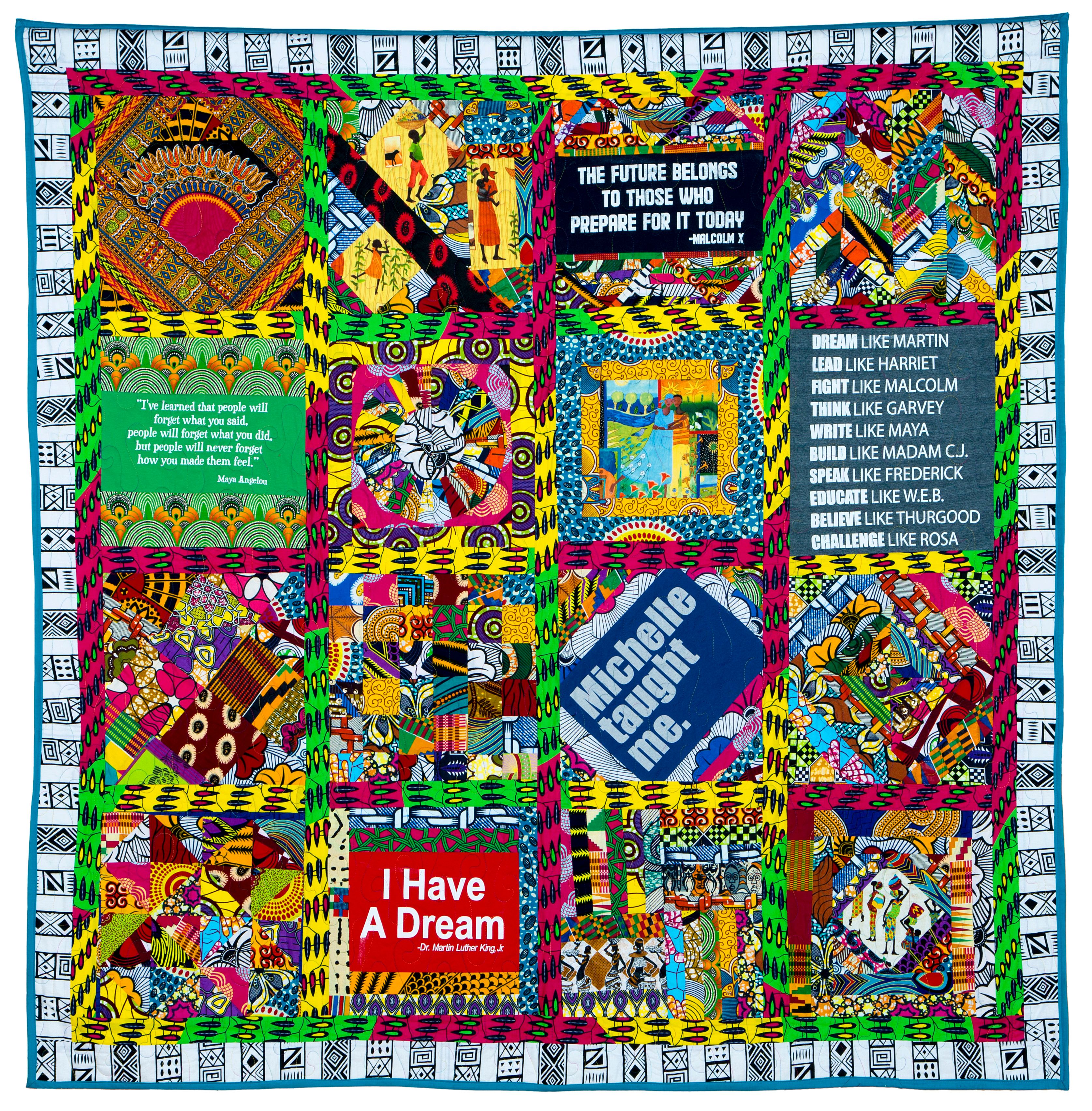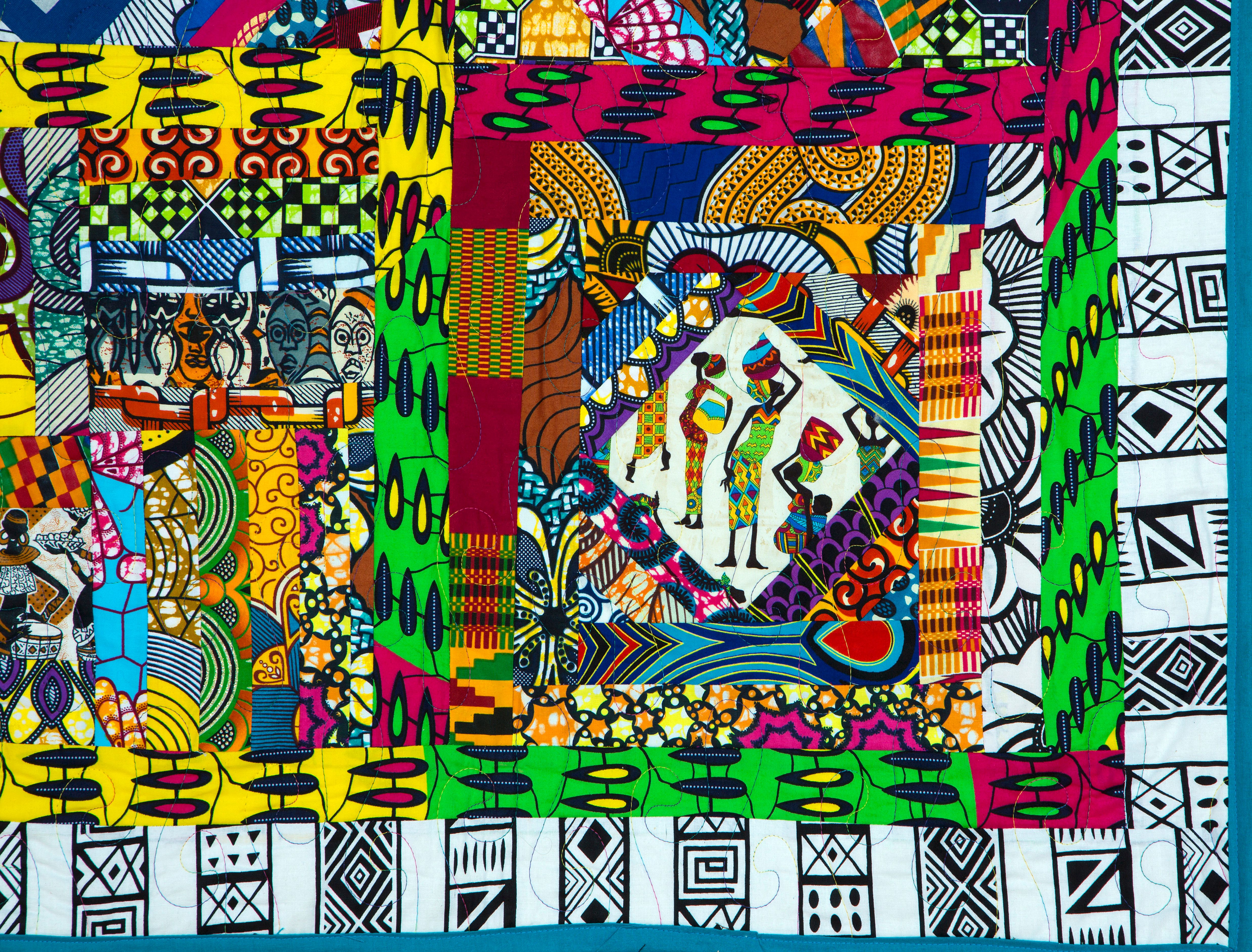 The unique exhibition represents 16 colorfully designed works of fabric art, which consist of an array of emotional social commentary and spiritual themes ranging in sizes from centerpieces to bed quilts. Many of the works display African print fabrics as well as recycled T-shirts and wooden sculptures.