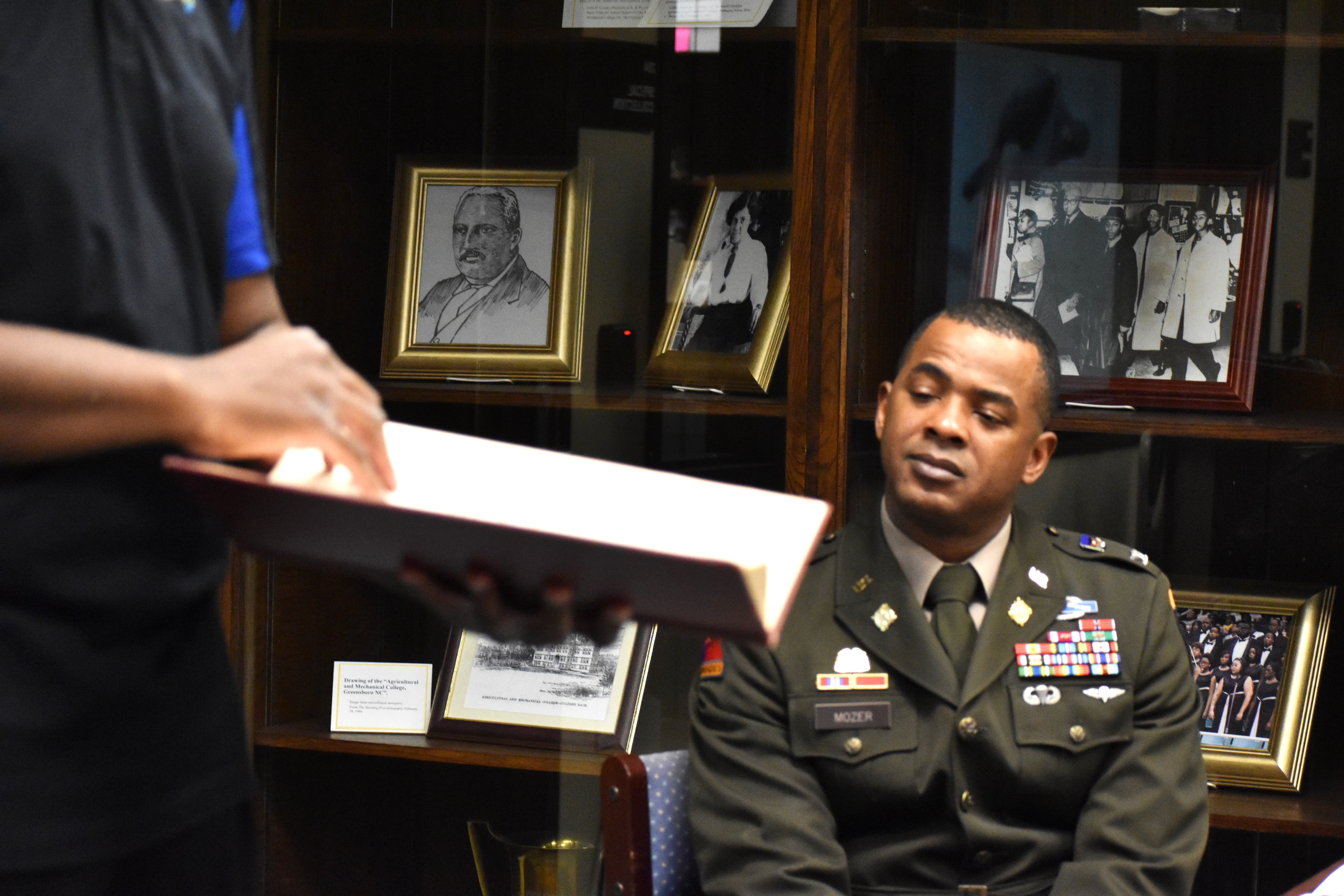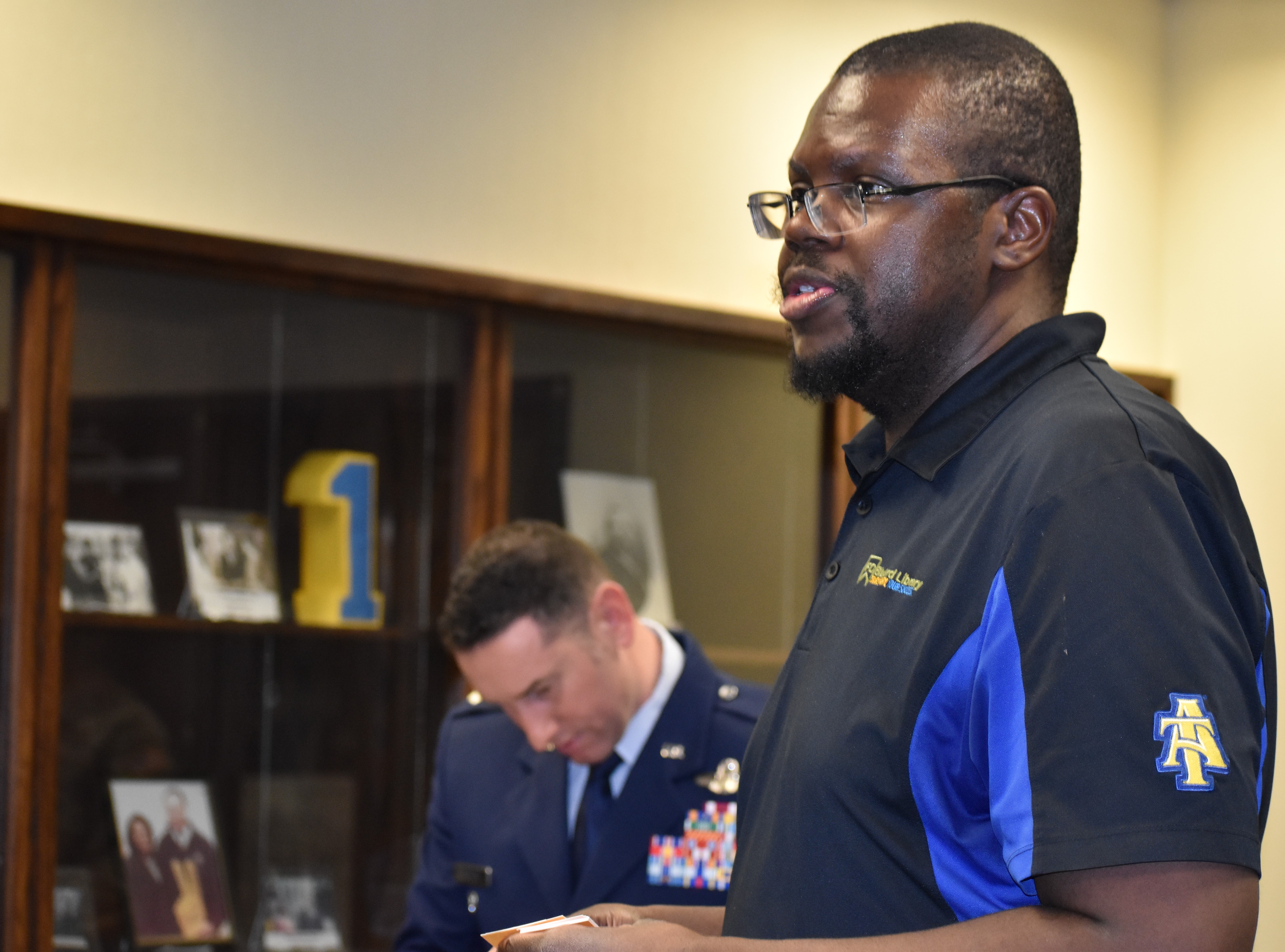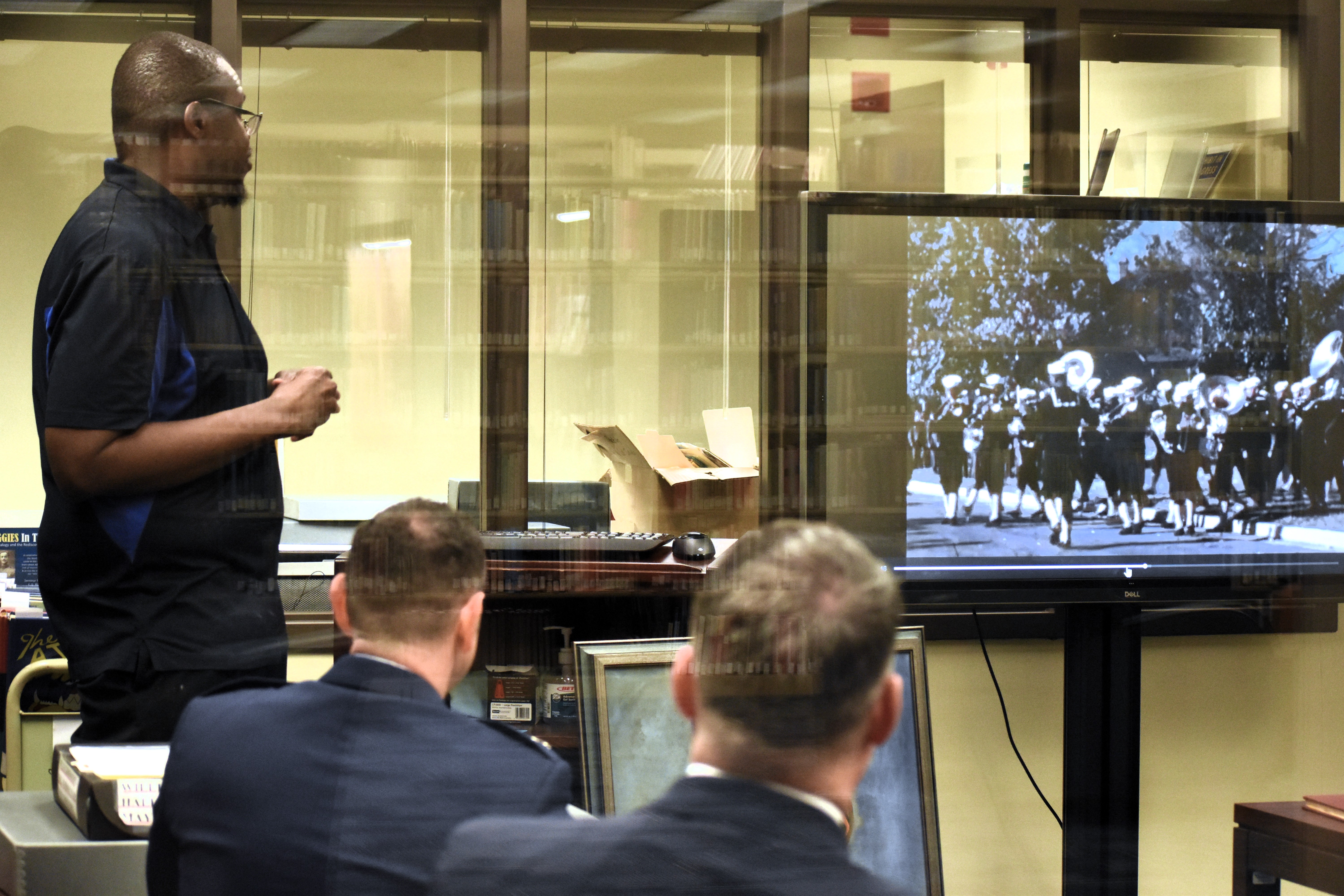 Stewart discussed and showcased many artifacts and connections A&T has with military history. He highlighted a $40,000 grant the Archives received to digitize 160 films, a few of which are from the World War II era.