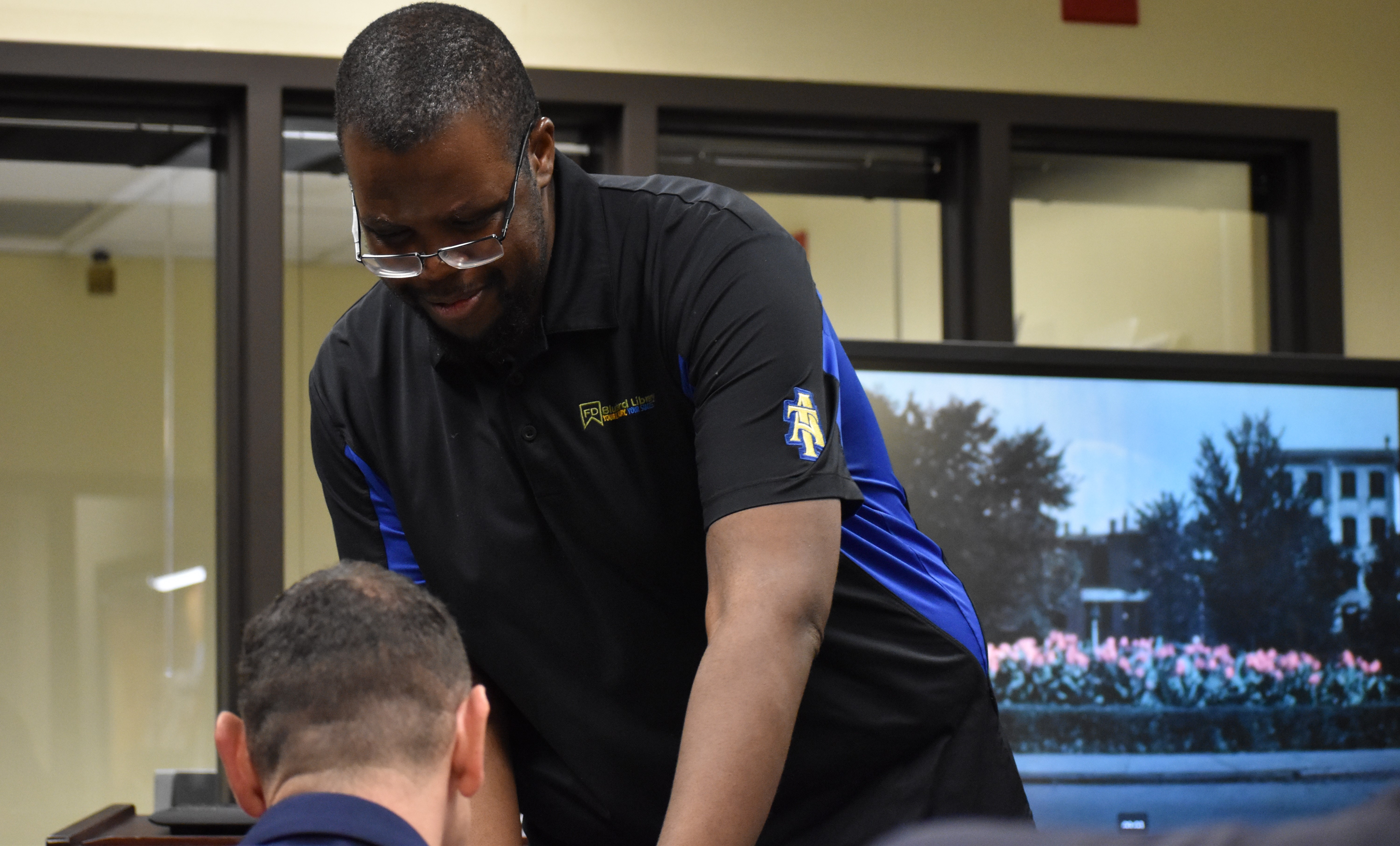 The group participated in a brief campus tour, which included time in F.D. Bluford Library Archives with James Stewart, Archives and Special Collections librarian.